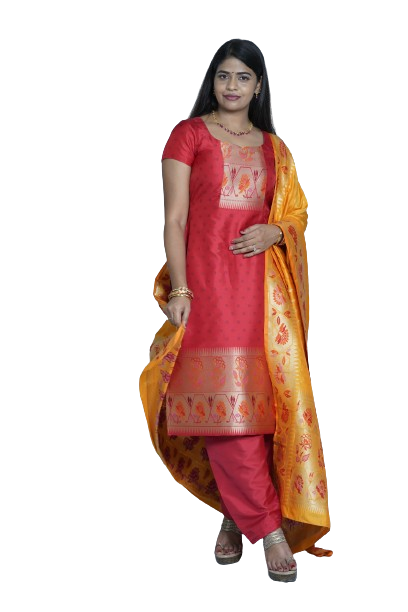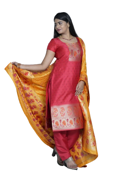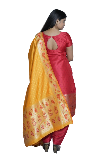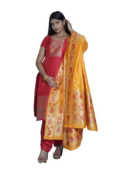 Combination of Banaras Unstitched Dress Material with Red Top Botton and Yellow dupatta Ideal for Indian Parties.