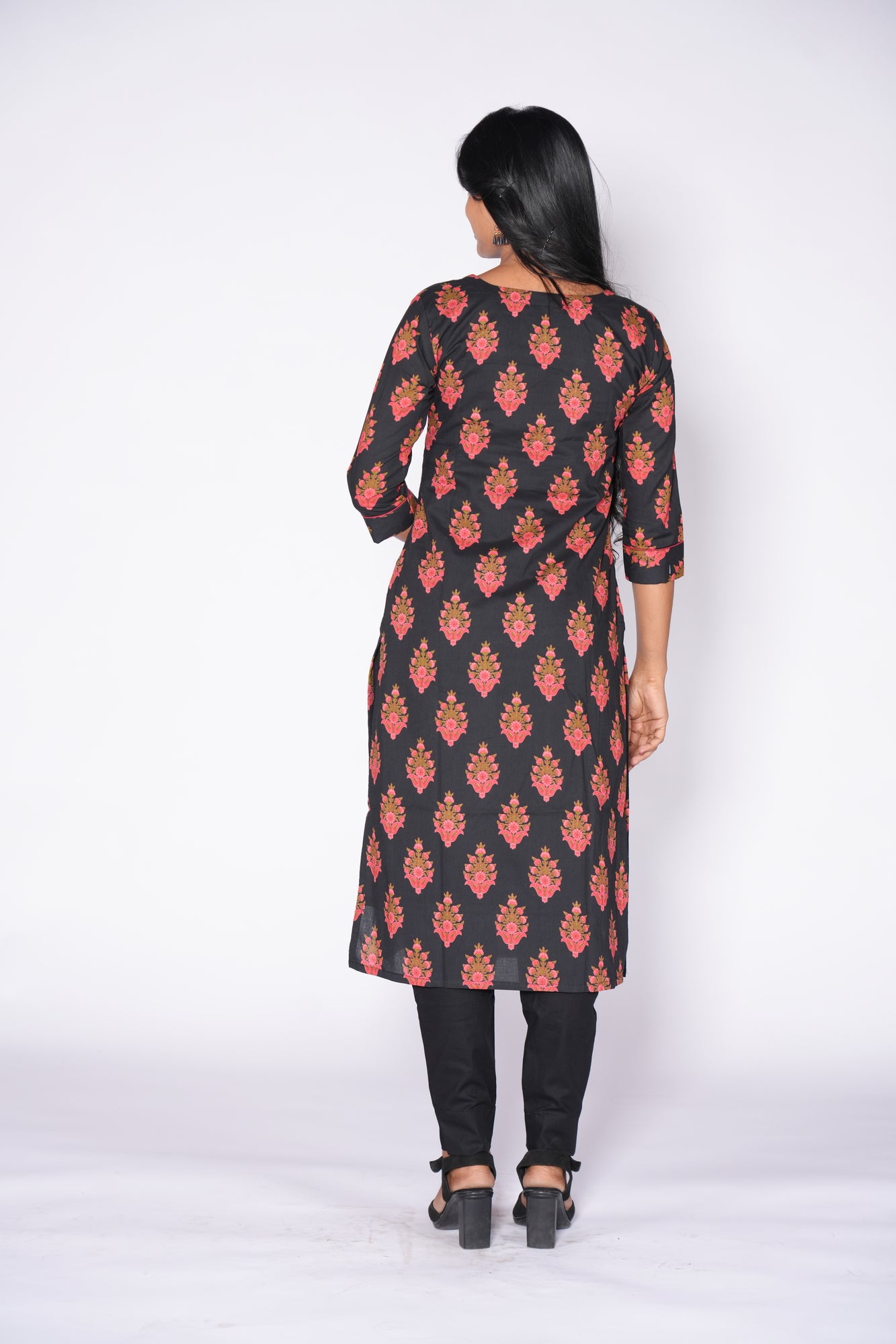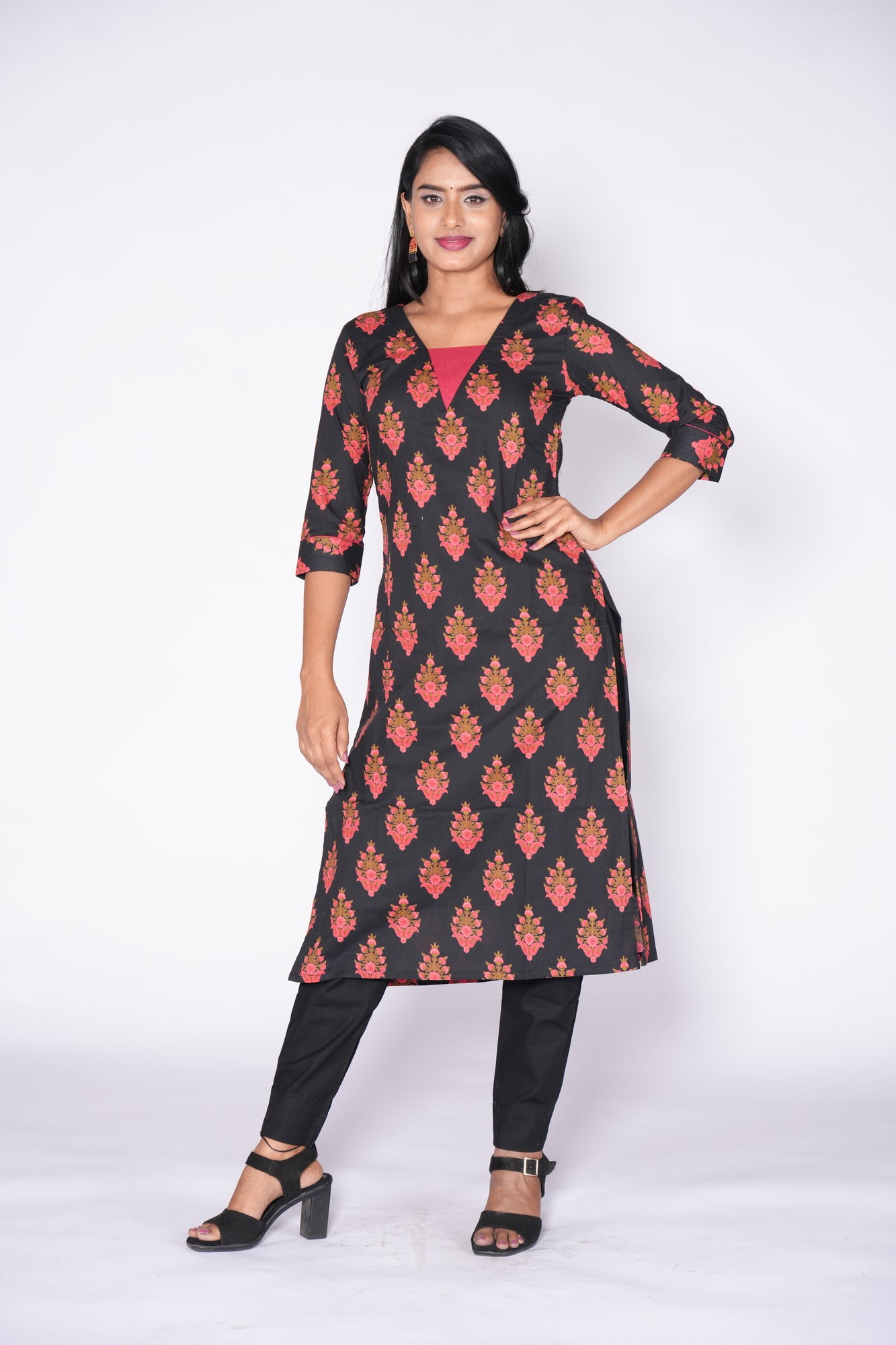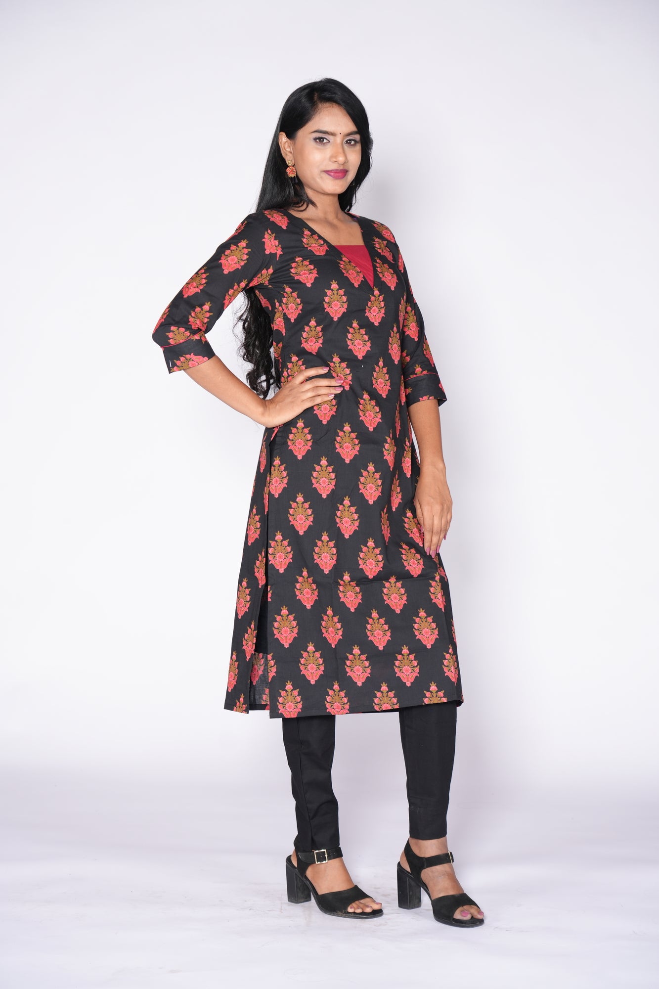 - Black Coloured Cotton Kurti withPeach Floral Printed cotton Fabric.