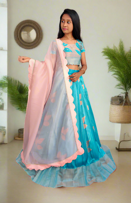 Make an unforgettable bridal statement with this breathtaking Chanderi Lahenga in Light Blue & Tan Color by sankalpoutfits.