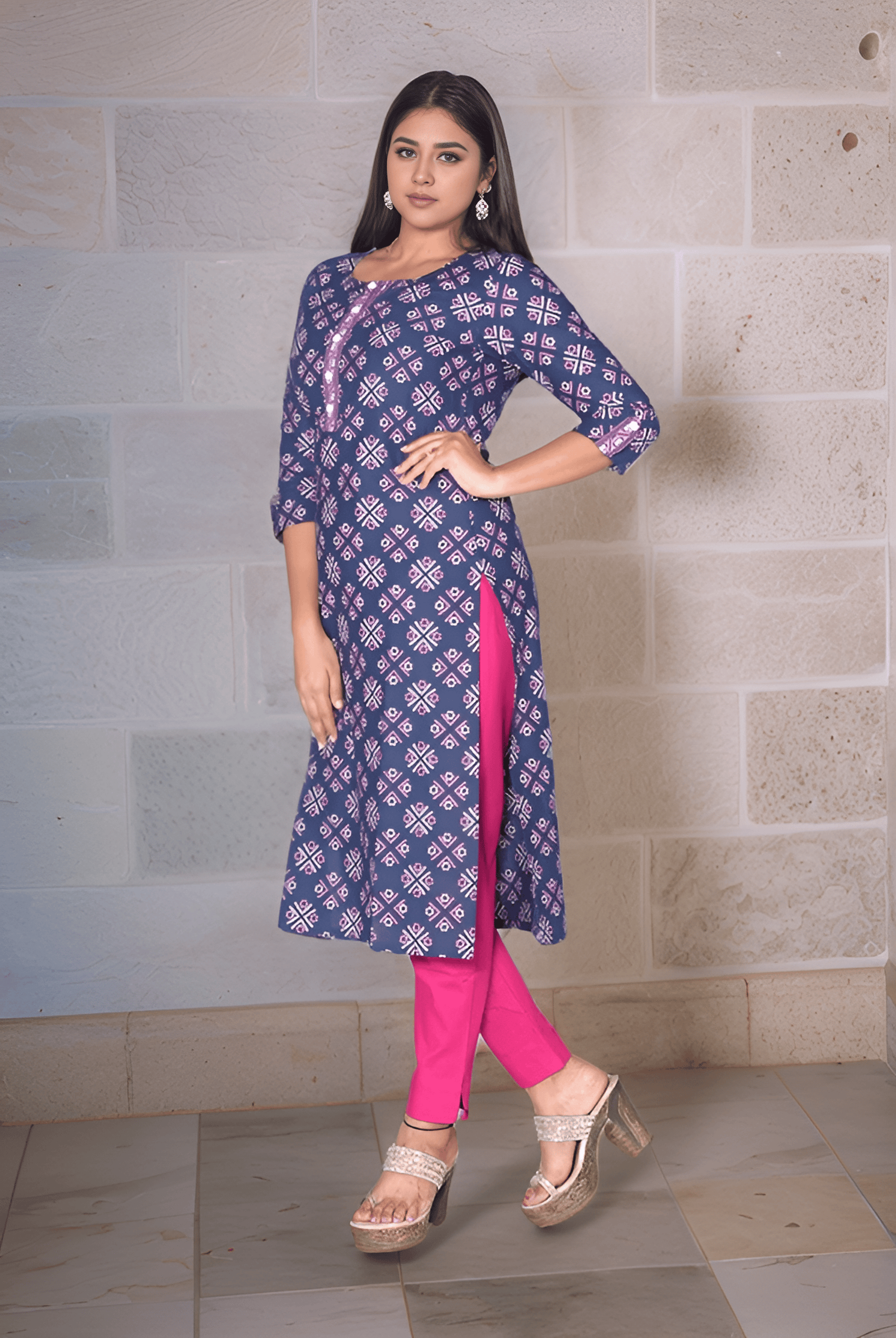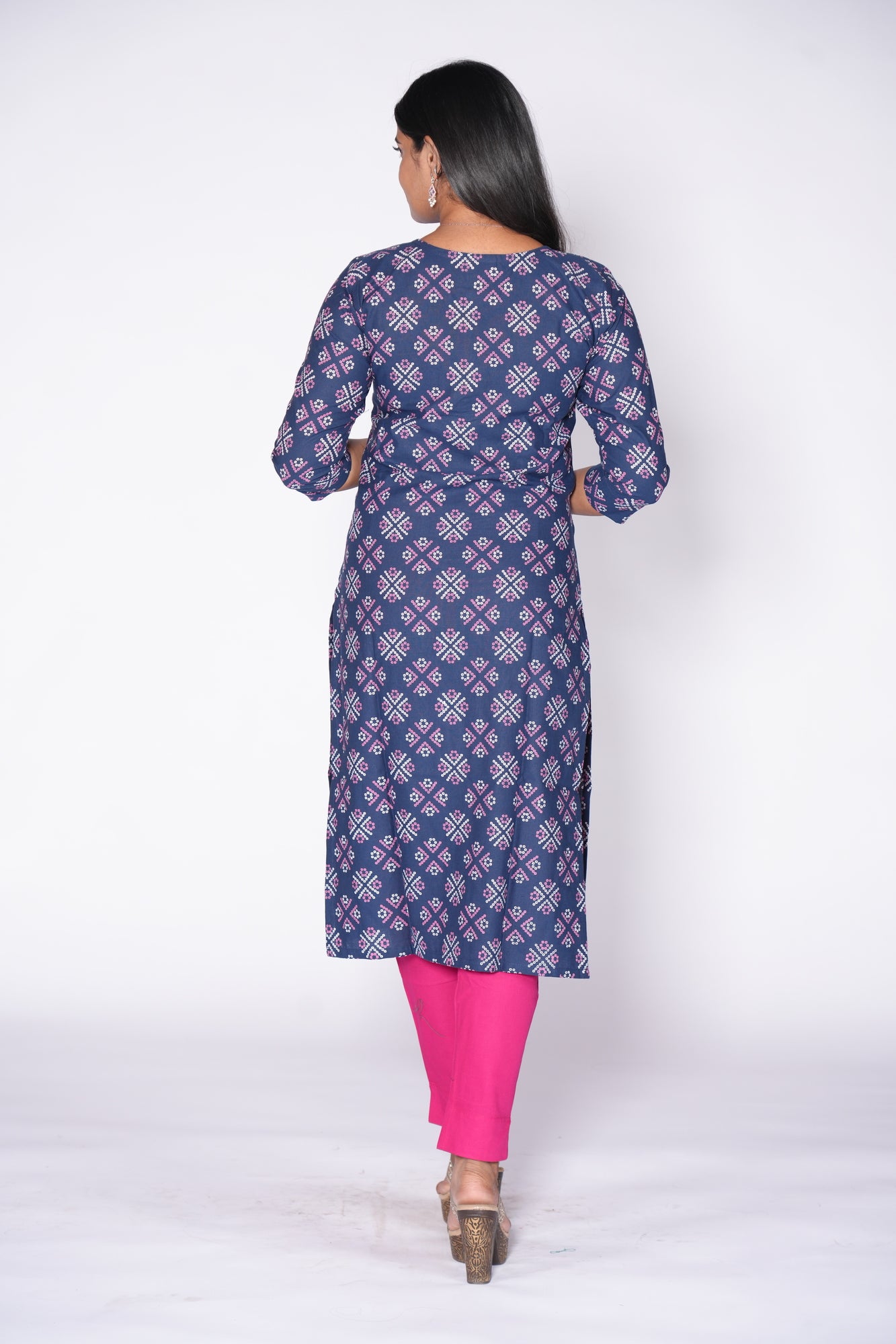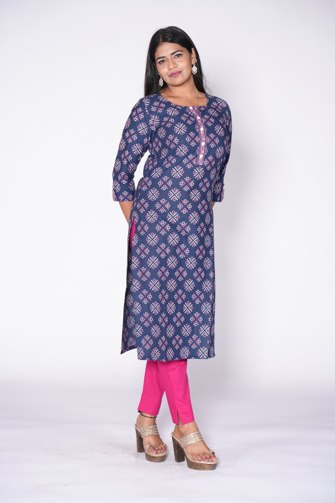 Knee-length Kurti in an elegant and versatile Dark blue shade Kurti.