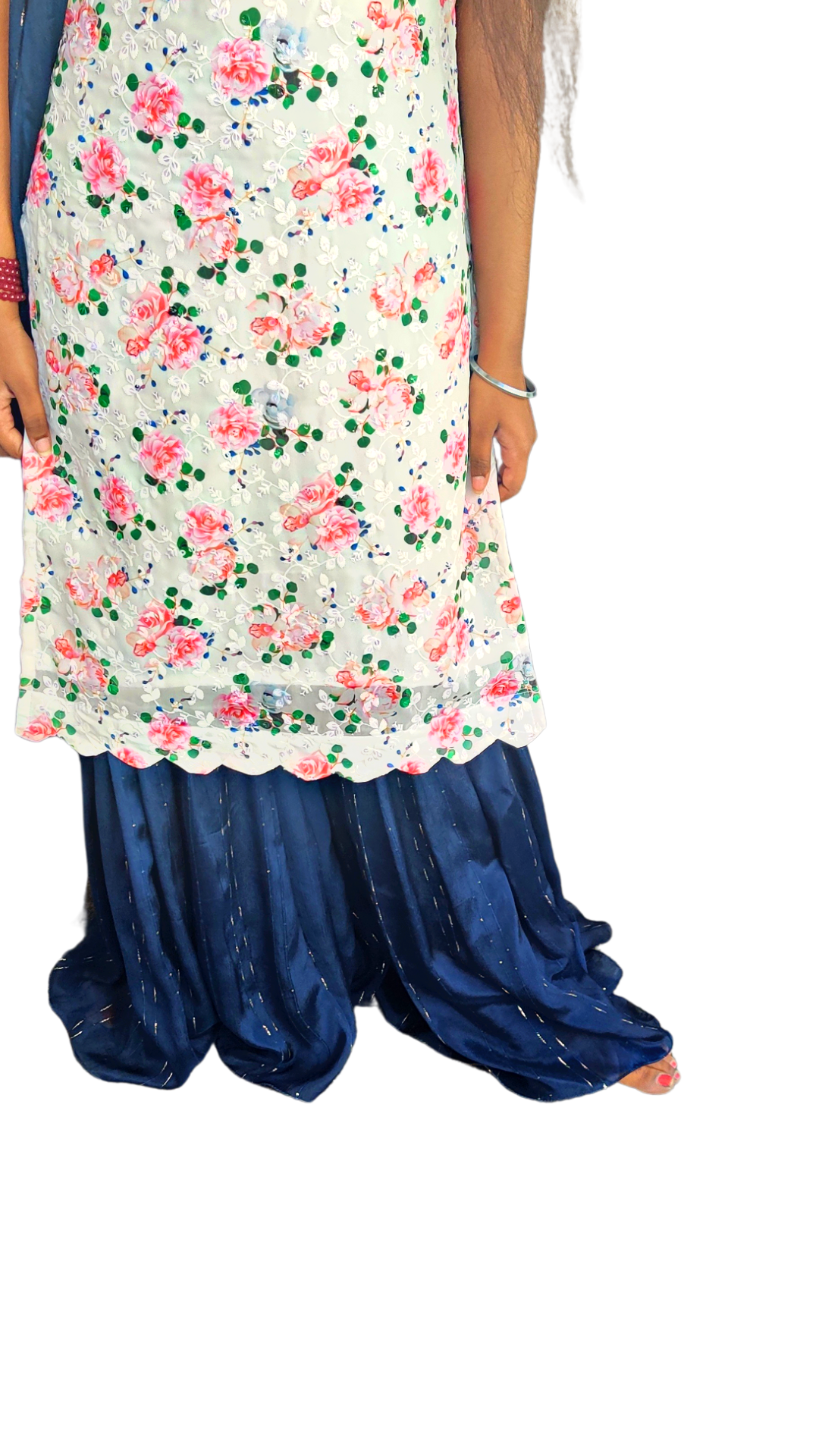 - Short white floral print Kurta with sequins combined with Navy Blue Designer Sharara and Dupatta Set.