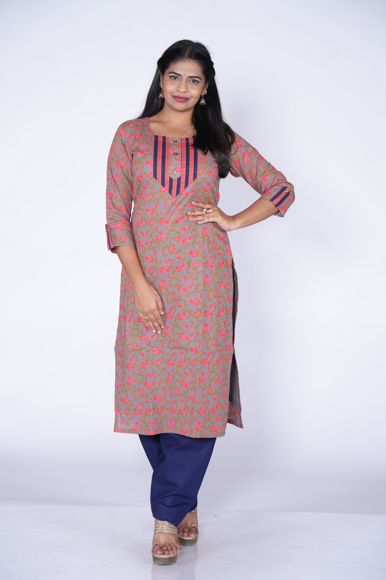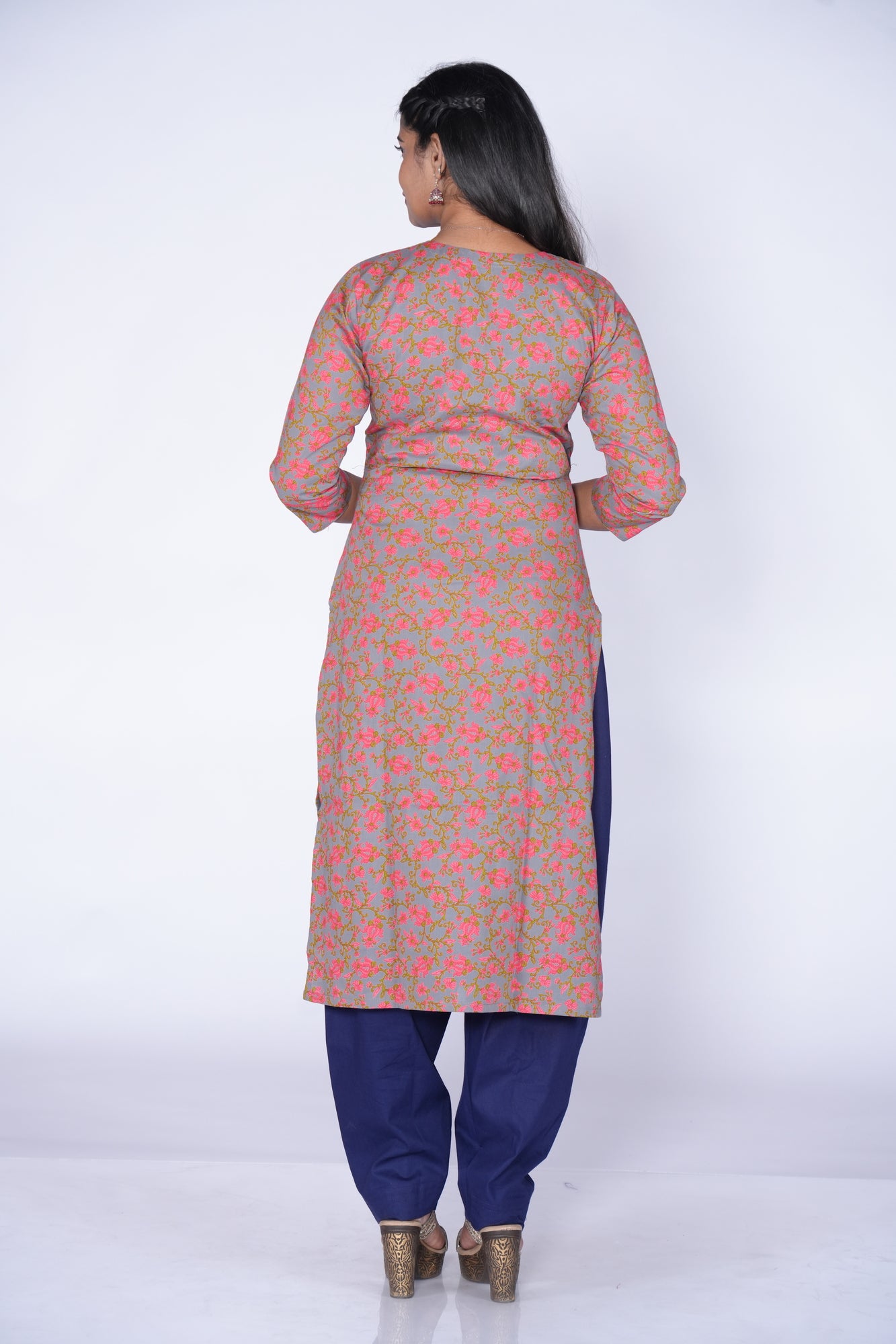 - The Grey-colored cotton kurti boasts a charming floral print, adding a touch of elegance to its design.
