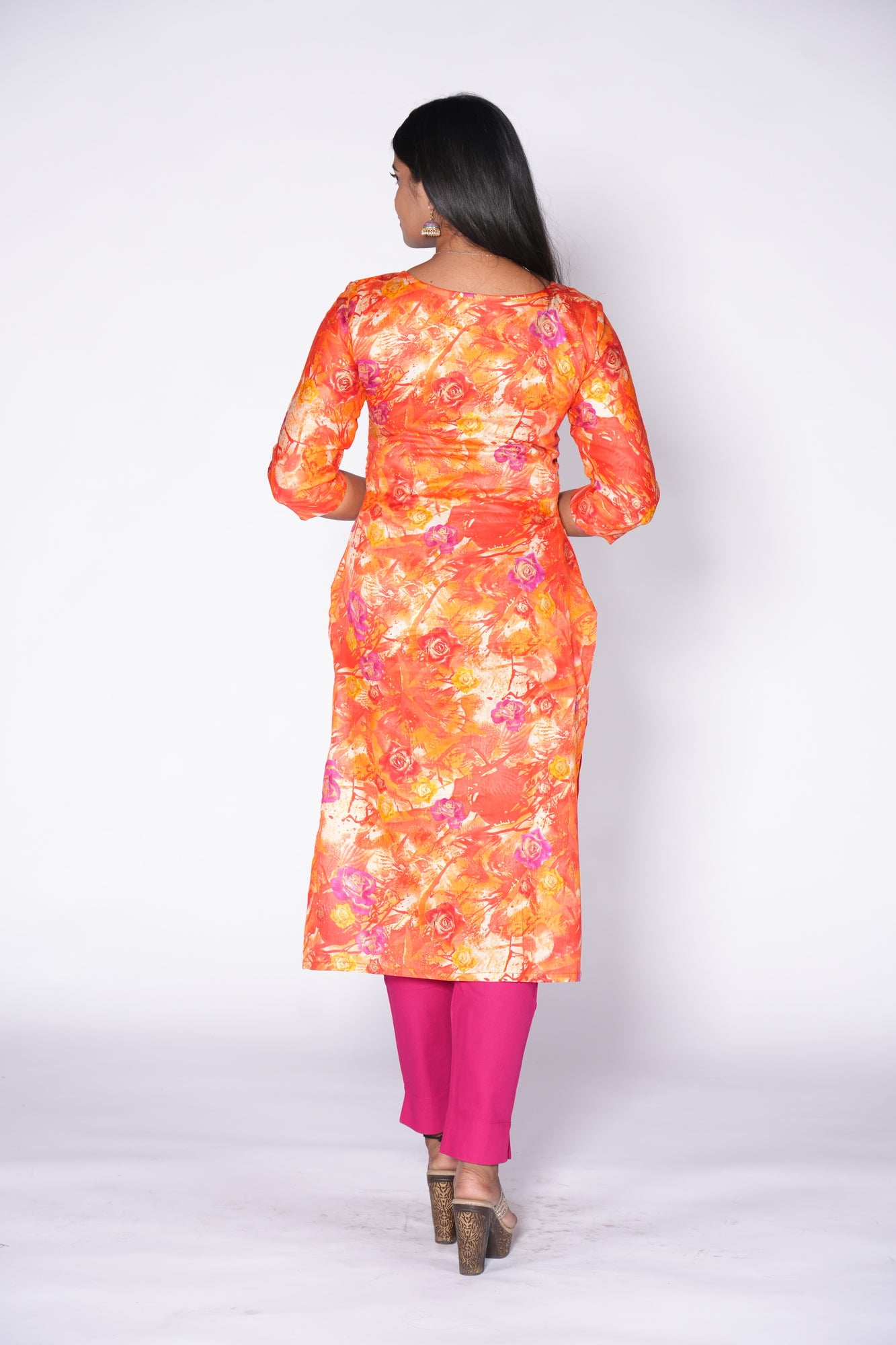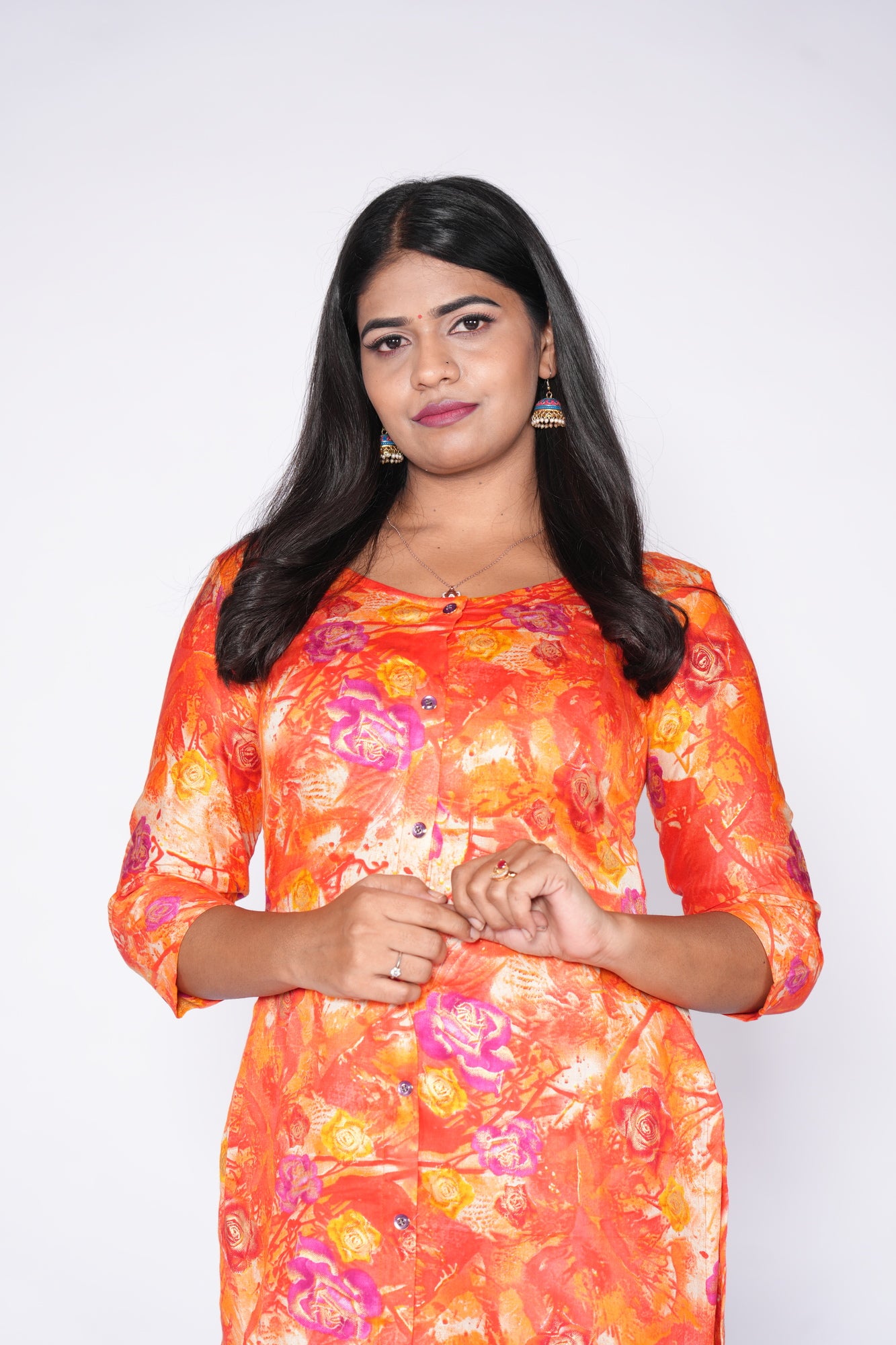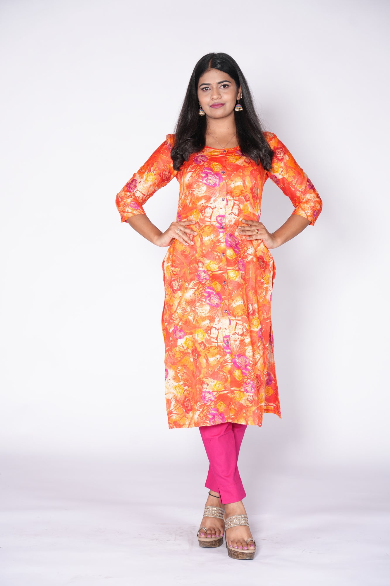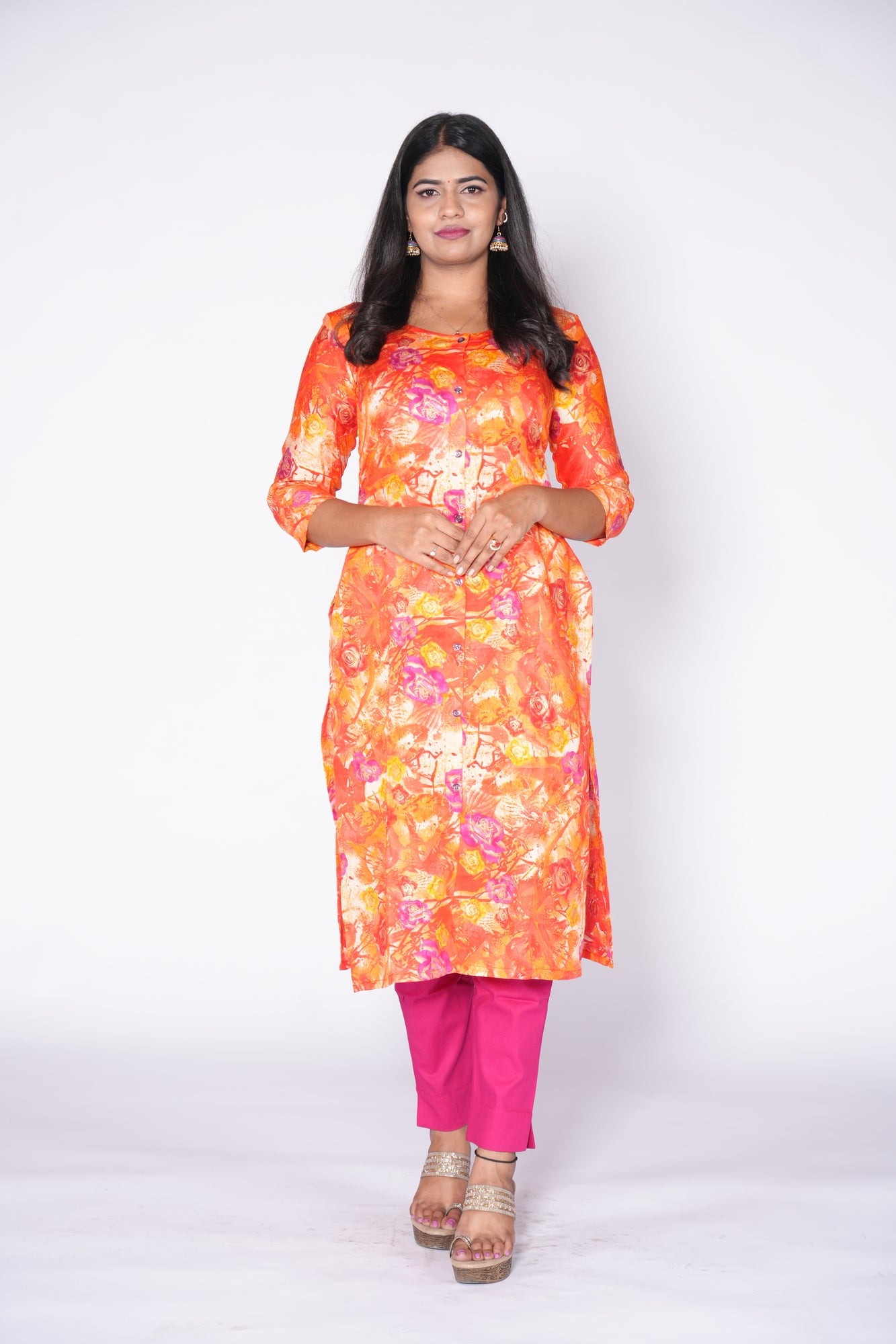 - Orange Rayon Cotton Kurta with multi-color print, perfect for Printed Rayon Kurti Design