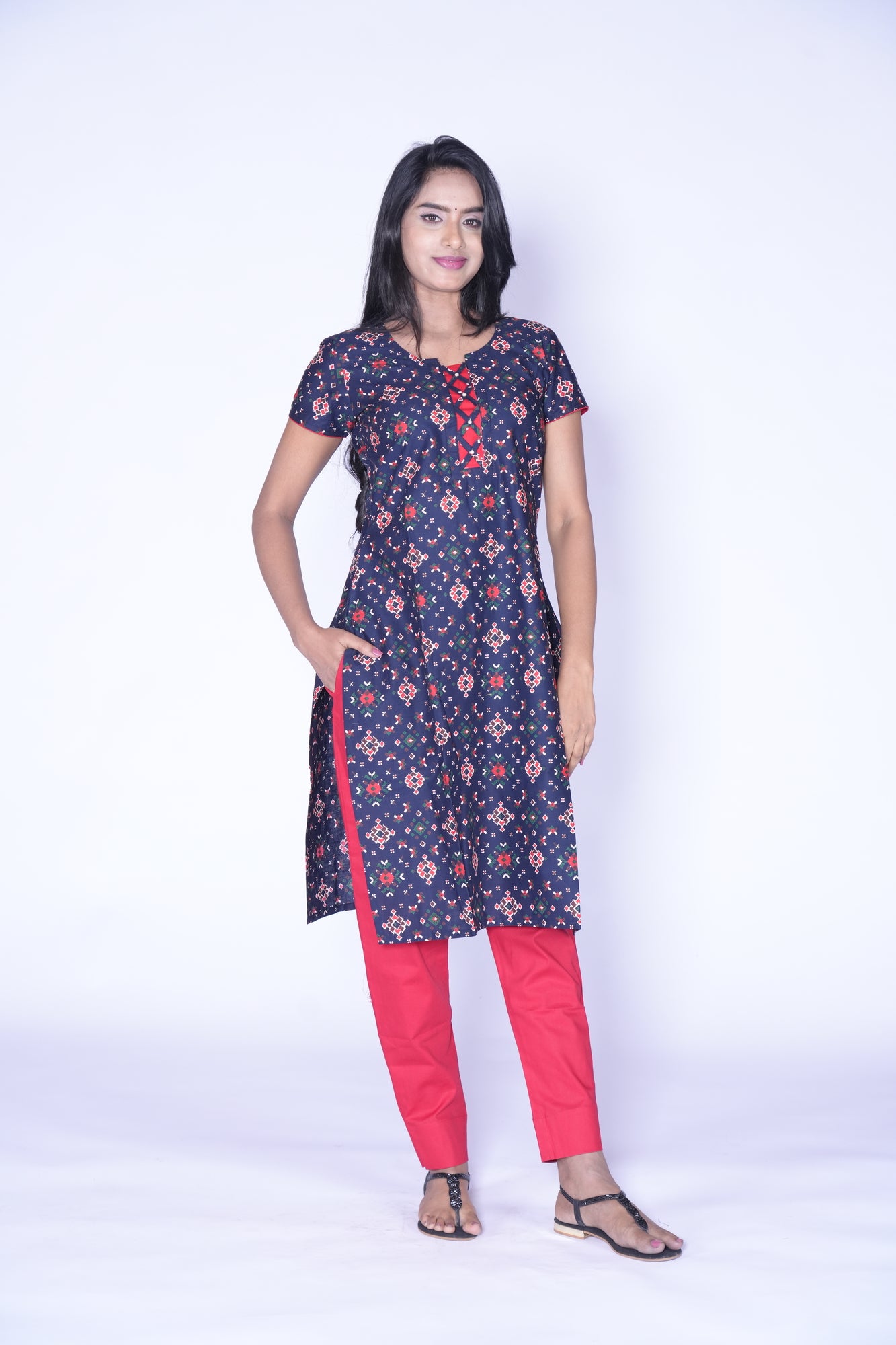 - Cotton kurti featuring a striking Patola design in a captivating black and red Kurti combination.