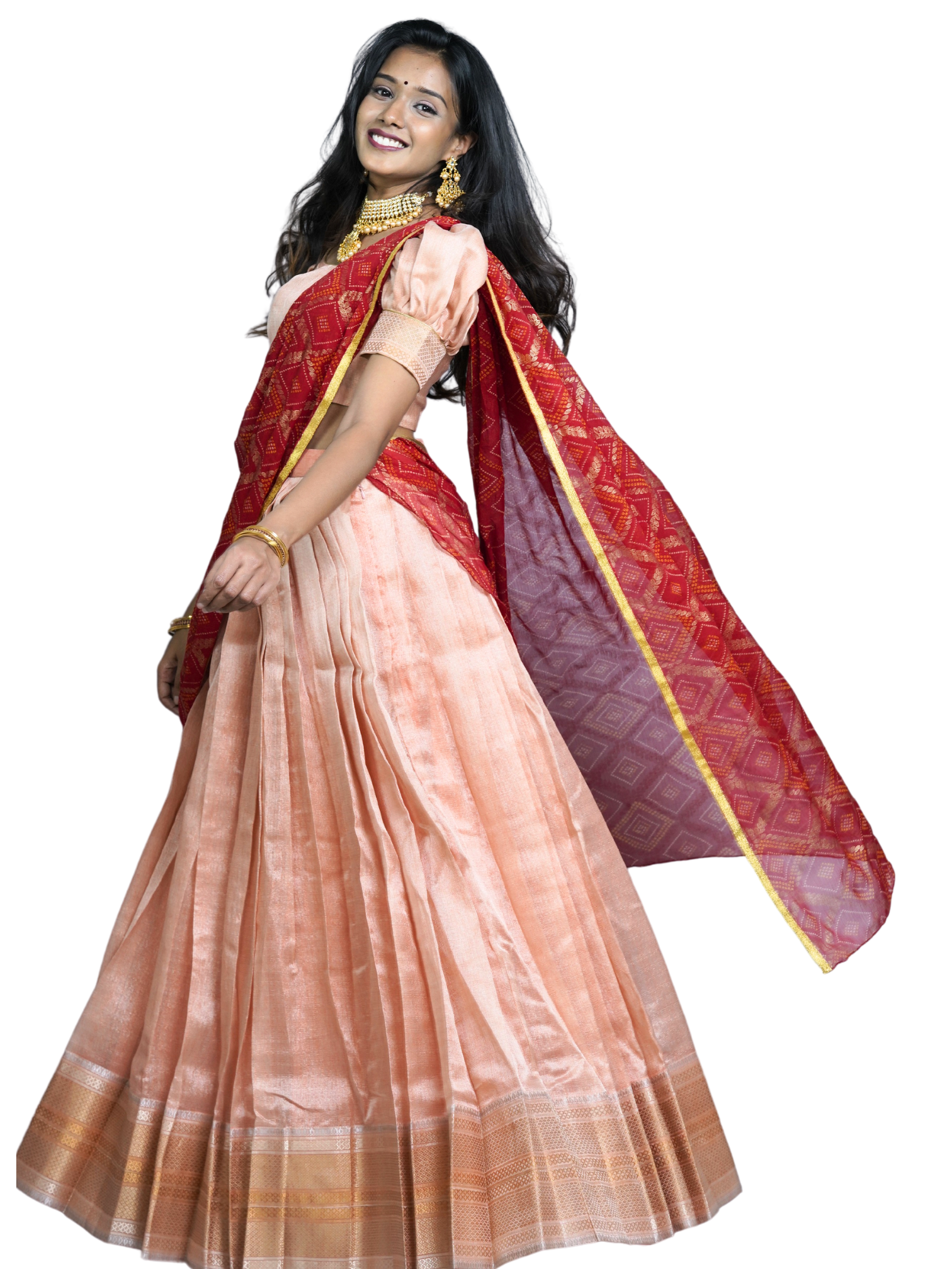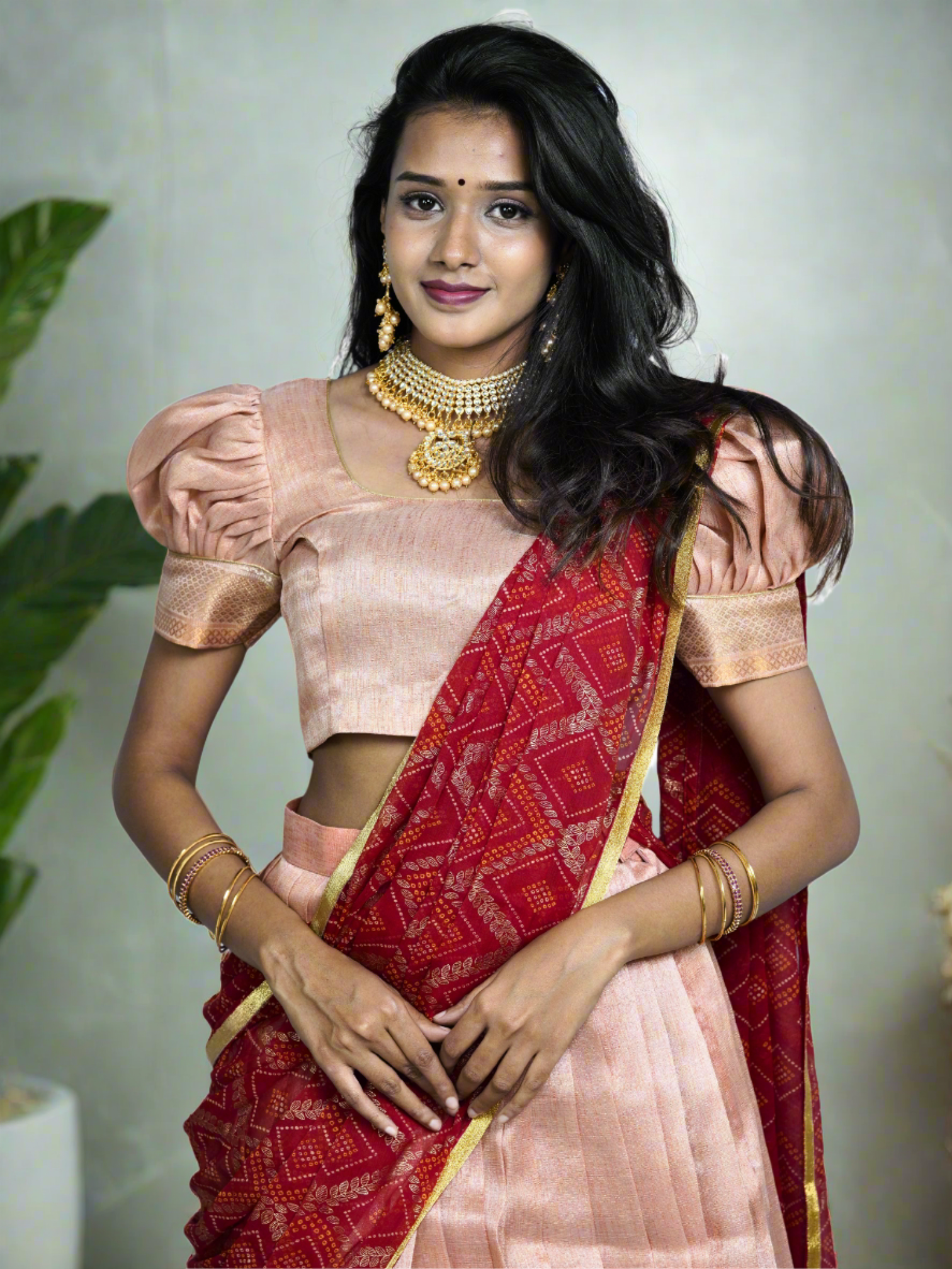 Take a peek at this beautiful and elegant Tissue Lehanga with Red Dupatta featuring an eye-catching Bandini print. This gorgeous outfit is perfect for any festive occasion.