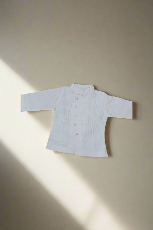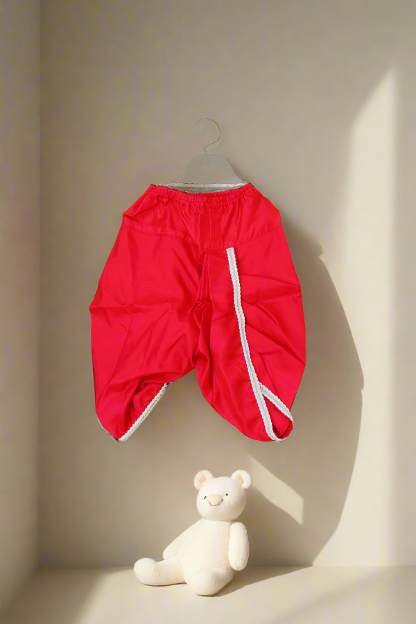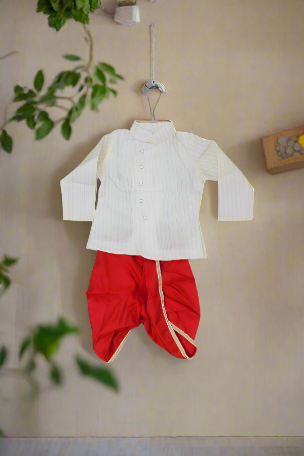 Dress your little one in our Kids' Traditional Wear set featuring a Premium Banaras Fabric Kurta matched with a high-quality Raw silk dhoti, highlighted with Lace and a round elastic waistband, and easy to wear with front open buttons, perfect for any festive occasion.