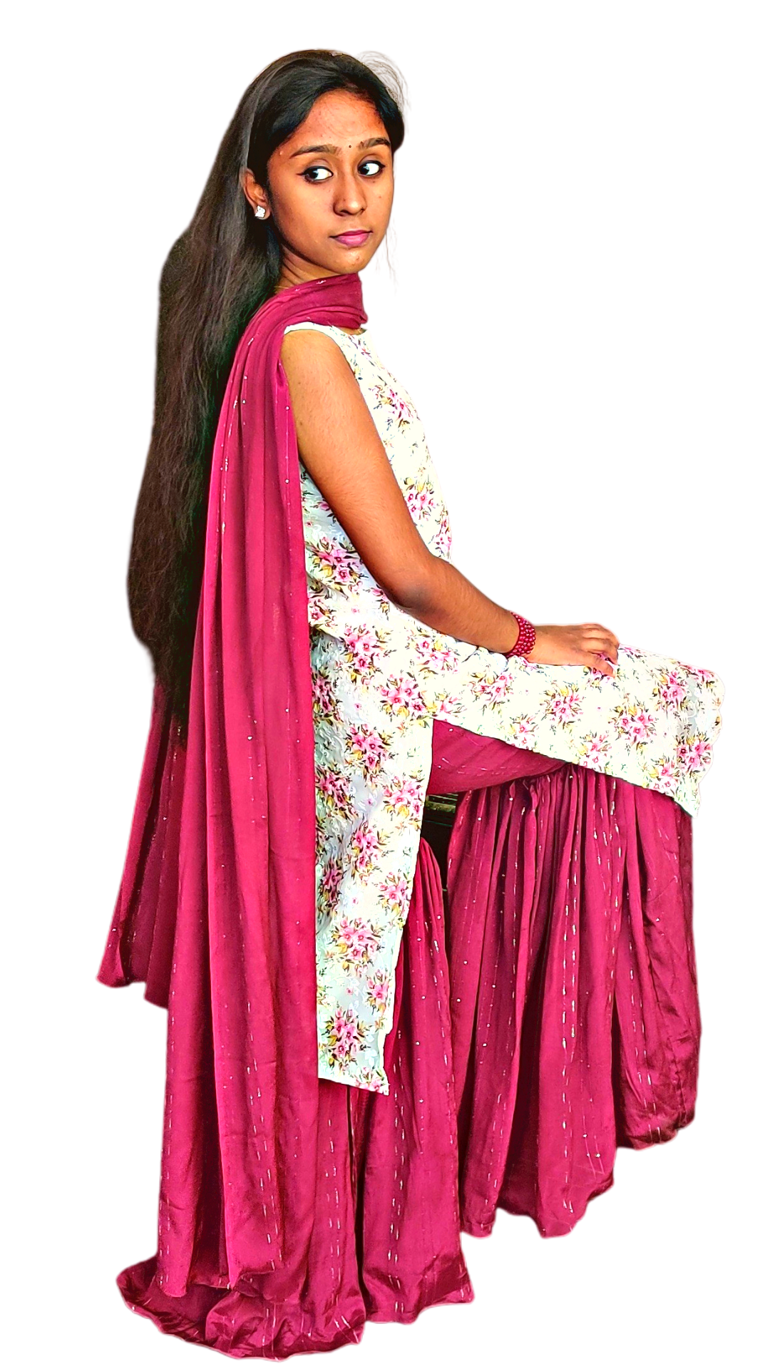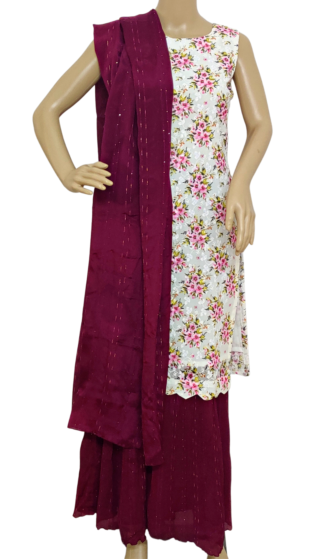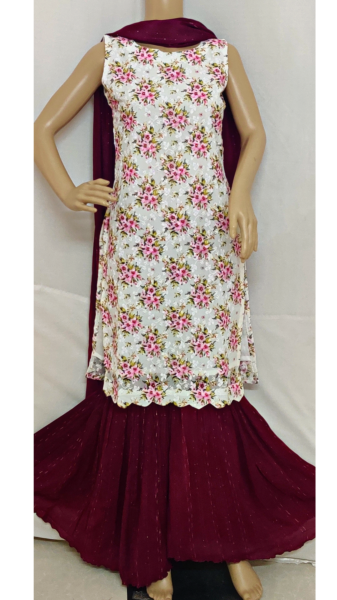 - Short white floral print Kurta with sequins combined with Wine Colour Designer Sharara and Dupatta Set.